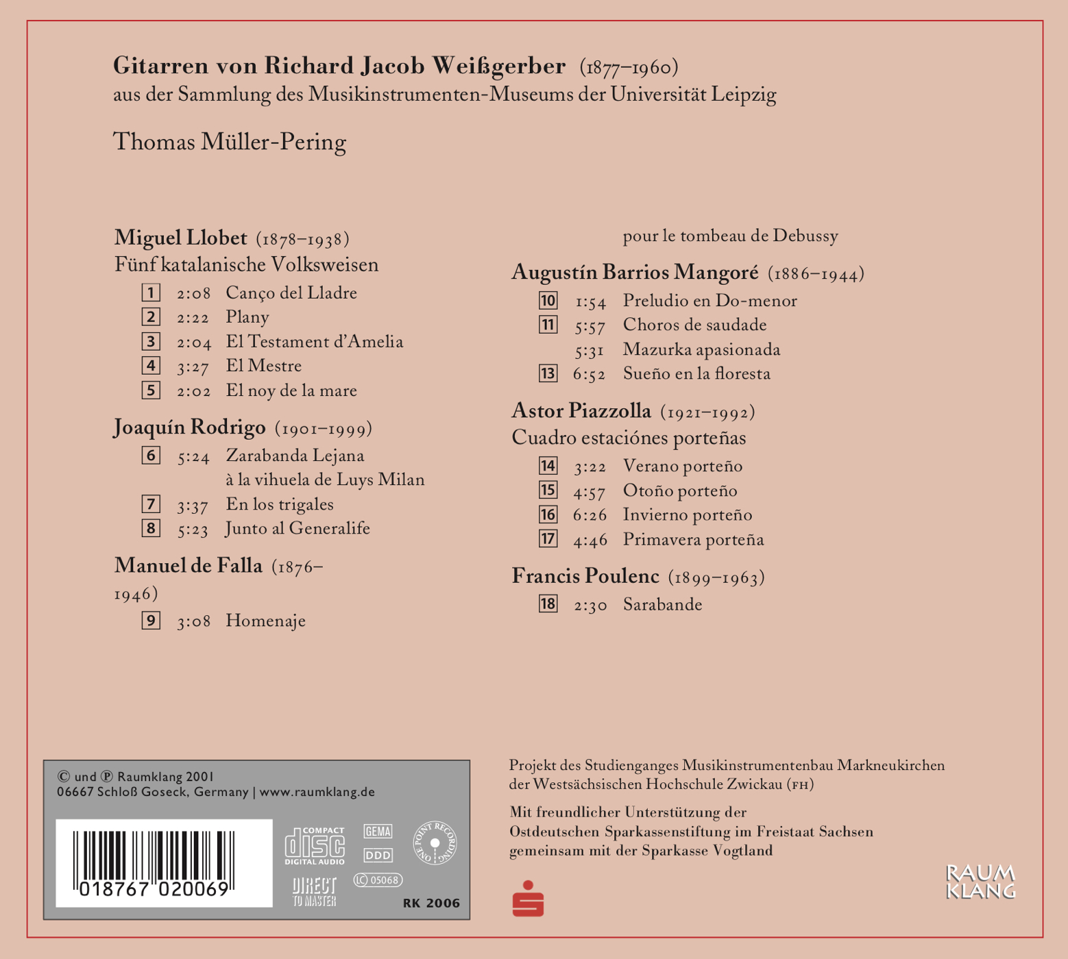 Das Musikinstrumenten-Museum der Universität Leipzig besitzt insgesamt 28 Gitarren aus dem Nachlass des Markneukirchener Gitarrenbauers Richard Jacob »Weißgerber«, der als herausragender Gitarrenbauer des 20. Jahrhunderts gilt. In Zusammenarbeit mit der Westsächsischen Hochschule Zwickau (FH), dem Institut für Musikinstrumentenbau Zwota und dem Gitarristen Thomas Müller-Pering von der Musikhochschule "Franz Liszt" in Weimar entstand neben der wissenschaftlichen Katalogisierung und Bilddokumentation der Instrumente eine umfangreiche Klangdokumentation, die auf dieser CD einen klanglichen Eindruck der Gitarren von Richard Jacob »Weißgerber« vermittelt.