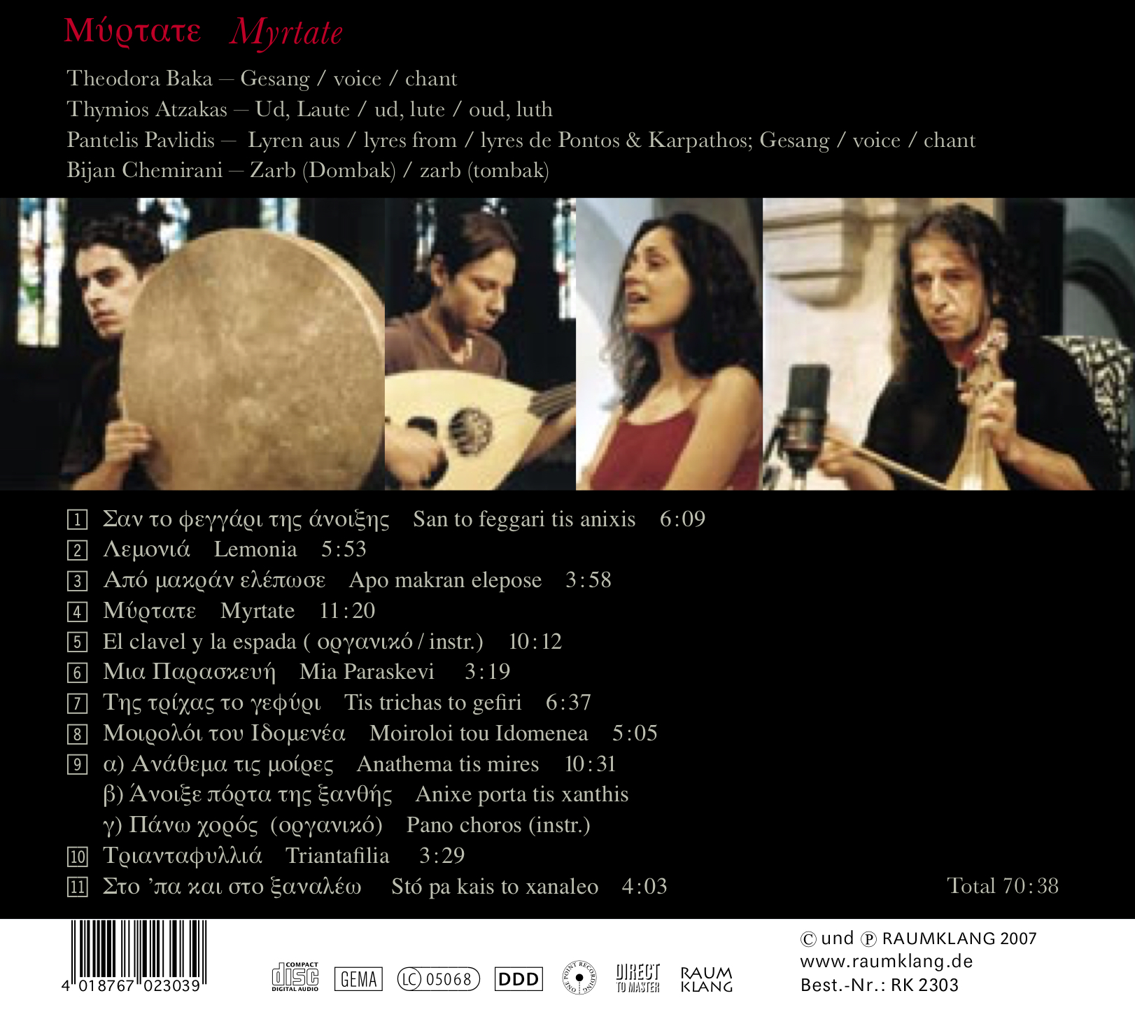 Seit ihrer Kindheit ist Theodora Baka aus Larissa/Griechenland mit den traditionellen Liedern ihrer Heimat vertraut. Mit dem Album „Myrtate“ gelingt ihr eine reizvolle Synthese aus traditioneller Musik unterschiedlicher Regionen Griechenlands und Einflüssen zeitgenössischer Elemente. Begleitet wird sie dabei von drei großartigen Musikern, die in einer außergewöhnlichen Besetzung (Ud, Lyren und Zarb) den sehnsuchtsvollen Grundton der Lieder unterstreichen. Ihre wandlungsvolle Stimme besingt dabei alte Epen ihrer Heimat, beklagt die verlorene Freiheit einer Braut, hält Zwiesprache mit einem Geliebten – dem sehnsuchtsvollen Klang ihrer Stimme kann man sich nur schwer entziehen.